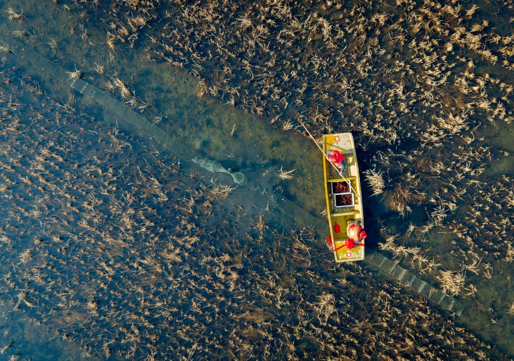 2024年12月28日,蝦農在湖北潛江後湖蝦稻共作立體模式試驗示範基地捕撈小龍蝦(無人機照片)。新華社記者 胡競文 攝