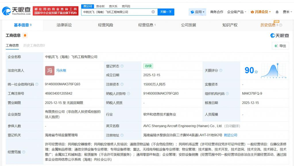 OCR:天眼查 都在用的商业查询工具 音老板 查关系查风险 上家中小业发量子意工期卜购 中航沈飞(海南)飞机工程有限公司 D 天限一下 应用 商务合作企业级产品 开通会员 费米 基本信息9 法律诉讼 经营风险 经营信息1 公司发展 知识产权 工商信息 单 天眼查 工商信息 历史工商信息 导出 企业名称 中航沈飞(海南)飞机工程有限公司 登记状态 法定代表人 存续 马永刚 天眼评分 90 成立日期 2025-12-15 统一社会信用代码 91460000MAK376FQ93 注册资本 15000万人民币 实缴资本 工商注册号 469034001205842 纳税人识别号 91460000MAK376FQ93 组织机构代码 MAK376FQ-9 营业期限 2025-12-15至无固定期限 纳税人资质 核准日期 2025-12-15 企业类型 有限责任公司(非自然人投资或控股的 法人独资) 行业 软件和信息技术服务业 人员规模 参保人数 英文名称 登记机关 海南省市场监督管理局 注册地址 海南省陵水黎族自治县三才镇664县道LAHT-01地块2号附近公司 许可经营项目:民用航空器维修:民用航空维修人员培训:道路货物运输(不含危险货物);民用机场运营(许可经营项目凭许可证件经营)一般经营项目:仪器仪表修 经营范围 理:金属制品修理:通信交换设备专业修理:专用设备修理:雷达、无线电导航设备专业修理:物业管理:技术服务、技术开发、技术咨间、技术交流、技术转让、技术 推广:金属加工机械制造:租赁服务(不含许可类租赁服务):通用零部件制造:企业管理:安防设备销售(经营范围中的一般经营项目依法自主开展经营活动,通过国 家企业信用信息公示系统(海南)向社会公示)