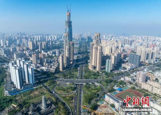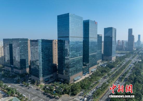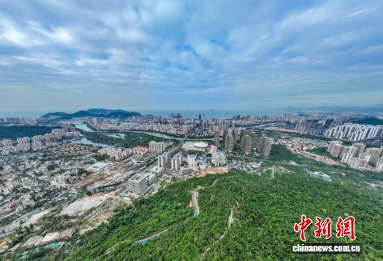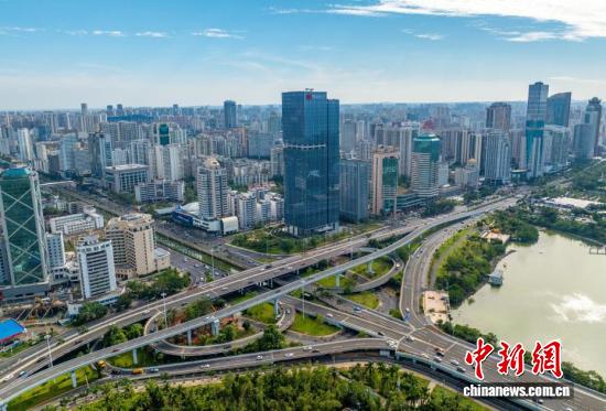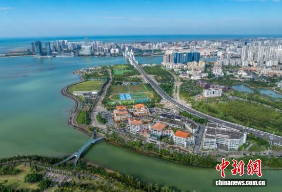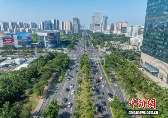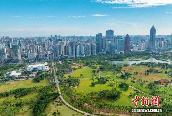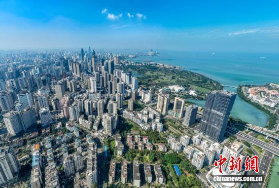 新社记者 骆云飞 摄!12月18日,海南自由贸易港正式启动全岛封关。图为2025年12月17日,海南省海口市滨海大道楼宇。(无人机照片)