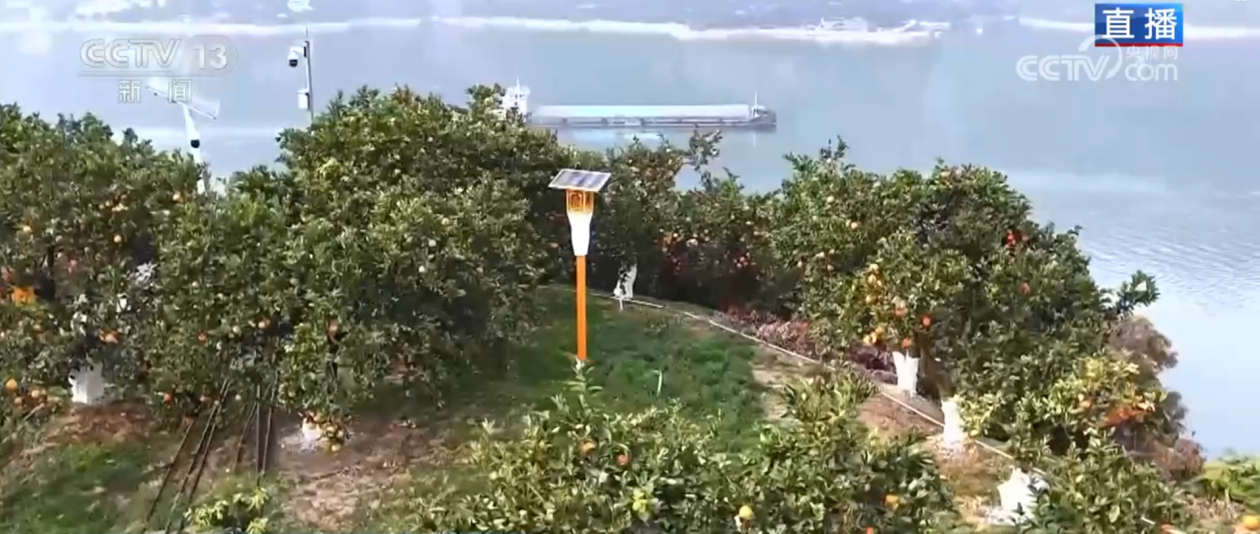 高品质的奉节脐橙也离不开这里推广的绿色种植技术。记者脚边的草叫紫花光叶苕子,它并非杂草,而是特意种植在这里的,可以用来保湿、增肥、改良土壤。此外,果园里还设置有太阳能杀虫灯,它可以根据虫害的类型选择光源,从而防控虫害。这些绿色防控技术让奉节脐橙的农药用量大幅降低,基本实现零农药残留,可以说是名副其实的绿色食品。现在,奉节脐橙的优质果率能够达到85%。