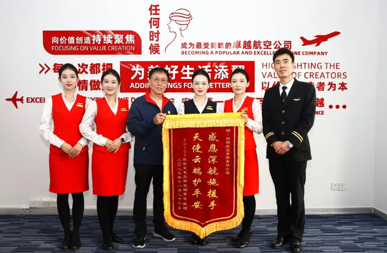 几天后,康复的旅客带着锦旗来到深航。“感恩深航施援手,天使云端护平安”——锦旗上的字,承载着一位老人最真挚的谢意。