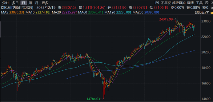 【环球网财经综合报道】北京时间12月20日凌晨,美国三大股指全线收涨,道指涨0.38%报48134.89点,标普500指数涨0.88%报6834.5点,纳指涨1.31%报23307.62点。英伟达涨近4%,波音涨近3%,领涨道指。万得美国科技七巨头指数涨1.2%,谷歌涨超1%,苹果涨0.54%。