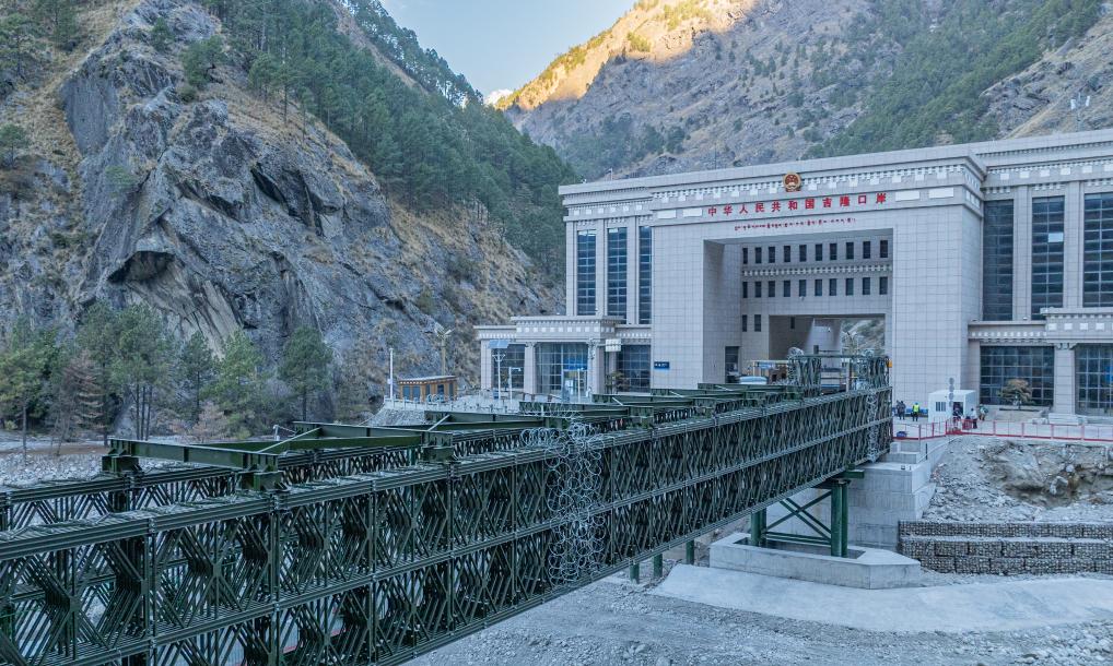 2026年1月1日拍摄的中国吉隆口岸和热索临时便桥(无人机照片)。