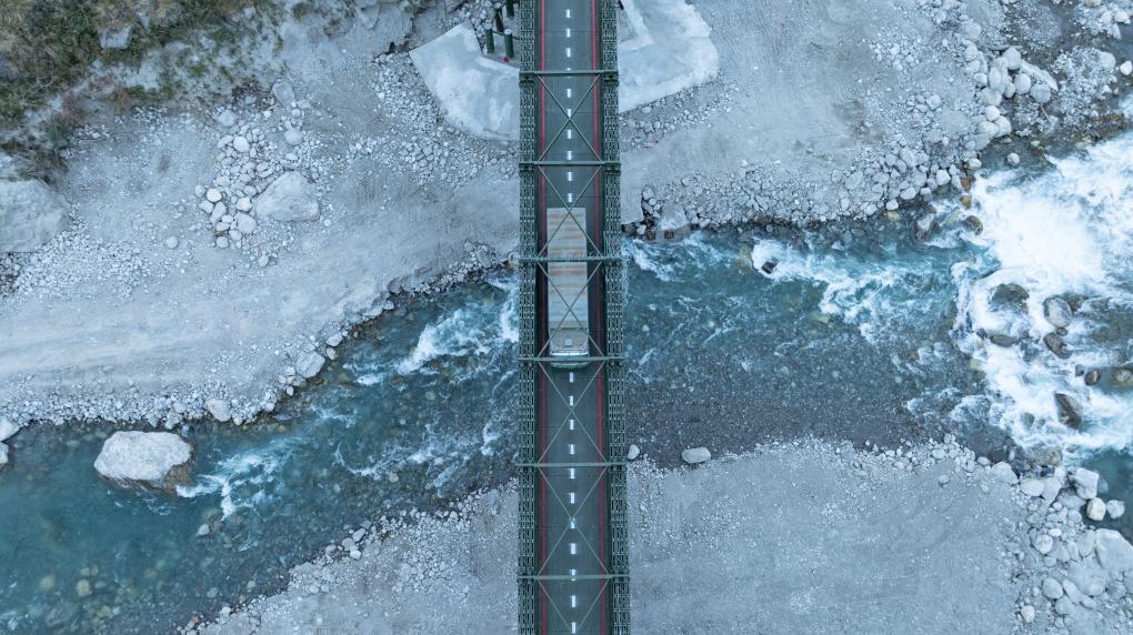2026年1月1日,一辆尼泊尔货柜车经热索临时便桥驶向中国吉隆口岸(无人机照片)。