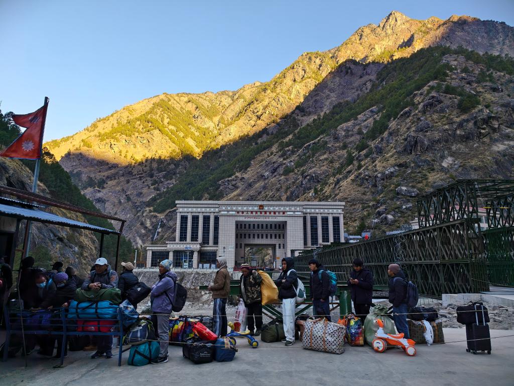 2026年1月1日,在尼泊尔热索瓦口岸,通过热索临时便桥进入尼方一侧的人员正在等待通关(手机拍摄)。