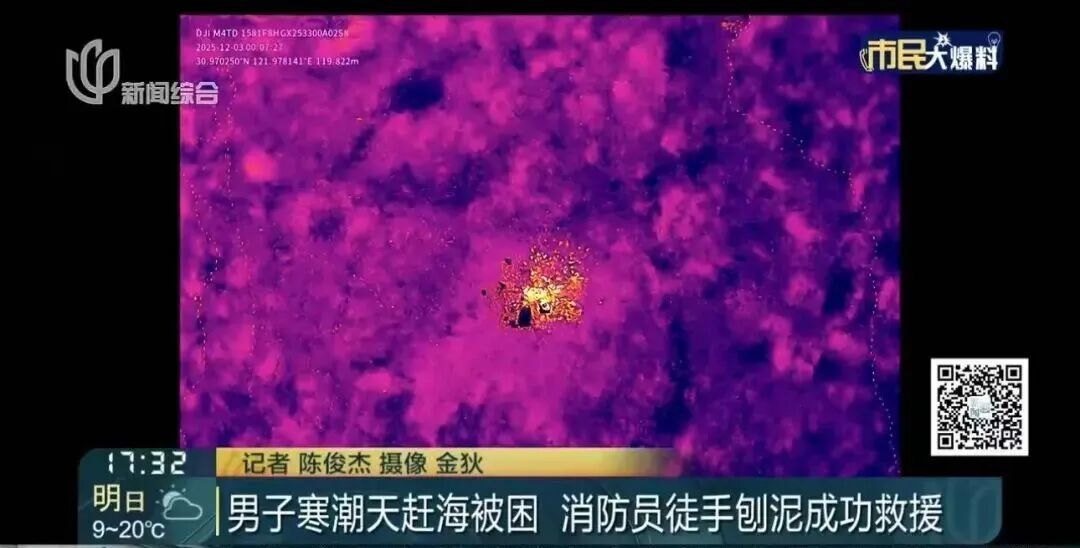 ●25年 12月2日,浦东消防接到报警称,一名男子在本市滴水湖滩涂附近赶海被困,深陷泥潭、无法离开。户外救援范围如此之大怎么找?所幸,无人机的高空视角和热成像锁定了位置,男子顺利获救。