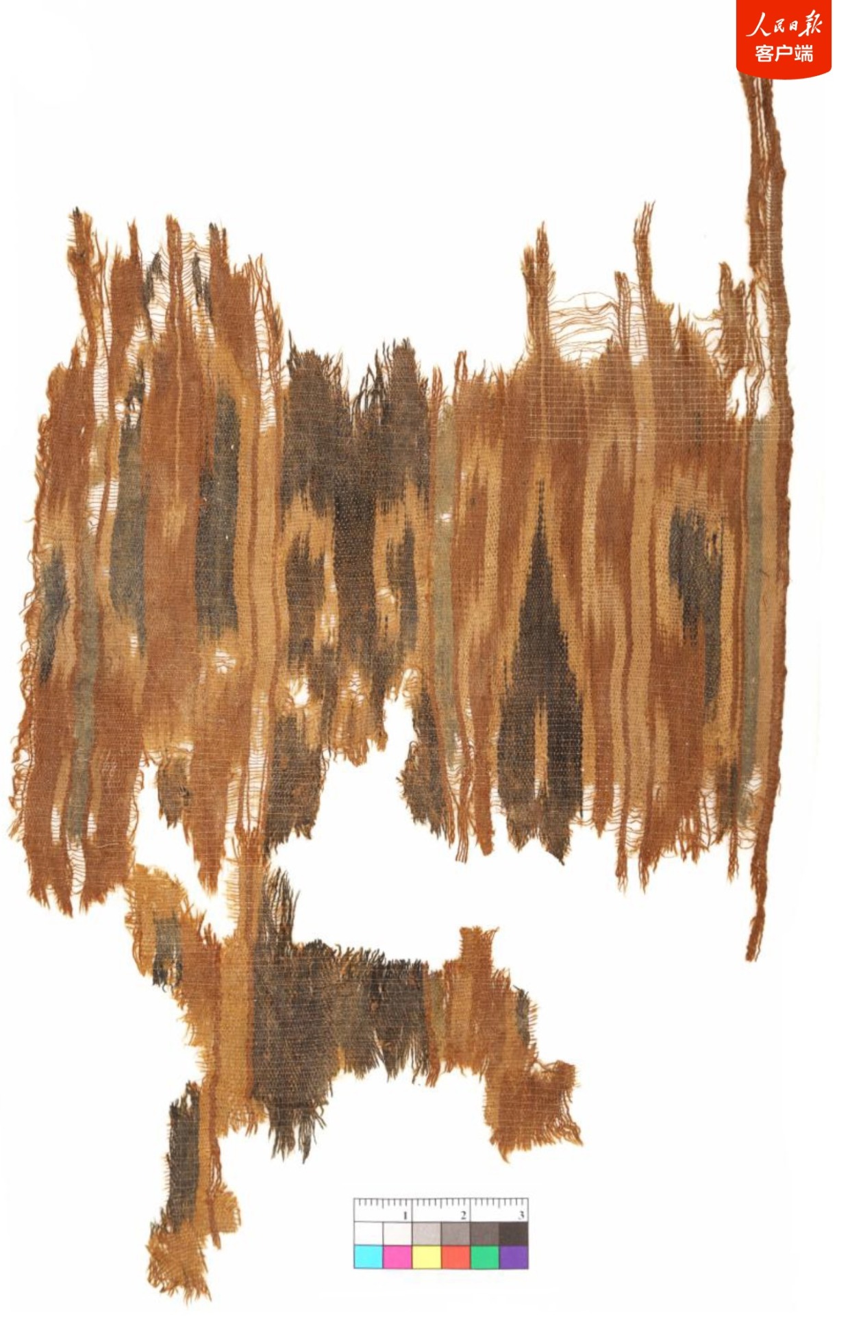 青海都兰热水墓群2018血渭一号墓出土扎经染色织物实物图。
