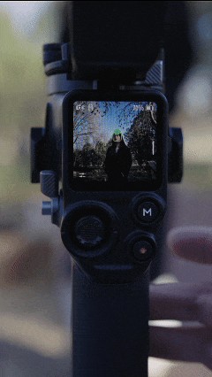 想要丝滑“刷锅”运镜或者需要边走边拍的时候,在稳定器上可以直接调取智能追踪模块画面,直接通过稳定器的屏幕点选锁定跟随对象,轻轻一滑框选目标,非常直观,俯拍仰拍转换更简单,行走拍摄也能更安全。
