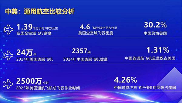 与美国相比,美国每平方公里的飞行密度是1.3,我们中国的空域飞行密度只有美国的30%;美国2024年拥有24万架通航飞机,中国只有2357架,占到美国的1.31%;通航的飞行作业时间,中国只有美国的4.26%左右。也就是说在通用航空低空方面,我们和美国还有巨大的差距。