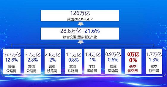 OCR:126万亿 我国2023年GDP ← 28.6万亿21.6% 综合交通运输相关产业 16.7万亿 3.7万亿 2.6万亿 1.1万亿 1.4万亿 0.9万亿 0万亿 1.7万亿 12.8% 2.8% 2% 0.8% 1% 0.6% 0% 1.3% 普通 高速 普通 高速 江河 海洋 低空 高空 公路网 公路网 铁路网 铁路网 运输网 运输网 航空网 航空网