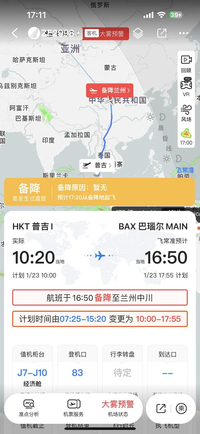 OCR:俄罗斯 17:11 0 394 ZE2998 客机 大雾预警 亚洲 哈萨克斯坦 回 蒙古 回顾 Pro' 网 乌兹别克斯坦 备降兰州> VR 中华民共和国 B 阿富汗 巴基斯坦 D 风场 晨 联 孟加拉国 印度 昏 国 线 17:00 泰国 D 普吉>寨 飞常准 斯里兰卡 帕劳 备降 备降原因:暂无 曾发生过盘旋 预计17:20从备降地起飞 尔 HKT普吉I BAX巴瑙尔MAIN 实际 飞常准预计 苏 10:20 16:50 当地 当地 计划1/2310:00 1/2317:55计划 航班于16:50备降至兰州中川 计划时间由07:25-15:20变更为10:00-17:55 值机柜台 登机口 行李转盘 到达口 J7-J10 83 待定 经济舱 动 大雾预警 凹I 乘 准点分析 机票服务 机场状态 值机截止 登利结束 K行时长 执飞机型