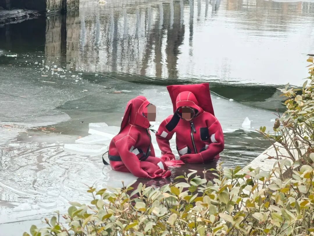 冰面救援时,队员特别容易失温,穿上干衣之后就不会丧失活动能力。除了干衣之外,队员还会加一件漂衣,以保证安全。“干衣很严实,但如果泡的时间太长,比如一个小时以上,也有可能渗水。”何昆说,所以他们通常采用“阶梯式救援”,也就是一组人下水15分钟后,换另一组。