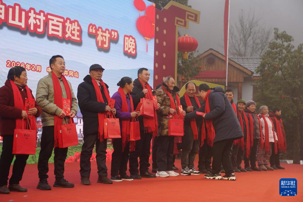 在神山村举办的联欢活动现场,村民们领取农业合作社发放的分红(2月1日摄)。为帮助村民致富,当地成立了茶叶、黄桃合作社,村民们每年都能得到分红。