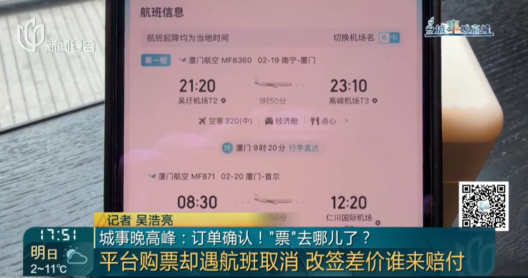 OCR:点城事晚高峰 新闻综合 1968 ¥ 厦门航空 国际直营旗舰店 全程 托运行李1x23KG,手提行李1x5KG> ¥ 退票费¥500起,改期费¥300起 预计1小时内出票 记者吴浩亮 17:56 城事晚高峰:订单确认!“票”去哪儿了? 明日 记者观察:关键信息”预计出票时间”平台部分产品不显示 2~11℃