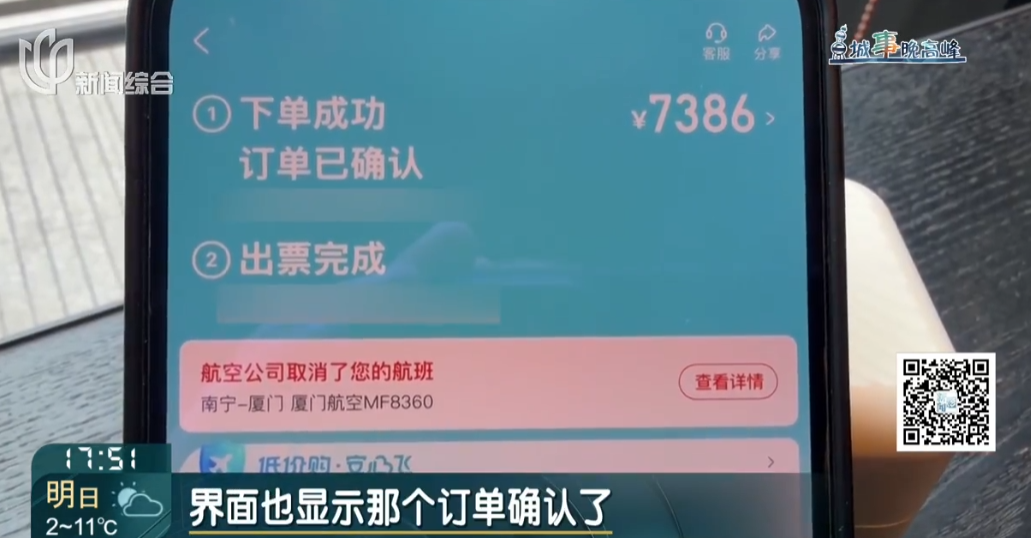 OCR:50 W 客服 分票 新闻综合 下单成功 ¥7386 订单已确认 出票完成 航空公司取消了您的航班 查看详情 南宁-厦门厦门航空MF8360 17:51 低价购·文心飞 明日 界面也显示那个订单确认了 2~11°℃