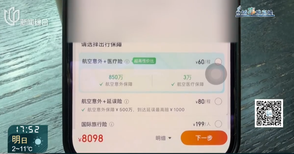 OCR:新闻综合 请选择出行保障 航空意外+医疗险 ? 超高性价比 ¥60/程 850万 3万 V航空意外保障 √航空医疗保障 航空意外+延误险 ¥80/程 V航空意外保障¥500万,到达延误最高赔¥1000 国际旅行险① ¥199/人 17:52 明日 ¥8098 明细 下一步 √ 2~11℃