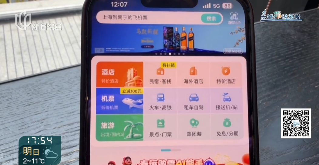 OCR:12:07 5G86 上海到南宁的飞机票 D 城事晚高峰 搜索 新闻综合 酒店出价 马载新推 文 老用利 有补贴 酒店 特价酒店 民宿·客栈 海外酒店 特价酒店 立减100元 机票 低价机票 火车·高铁 租车自驾 接送机/站 旅游 出境/国内游 景点·门票 跟团游 免息/分期 17:54 明日 2~11°℃ 绿购票能手