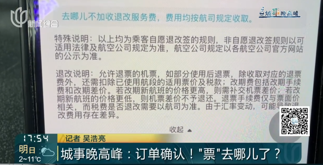 OCR:1 去哪儿不加收退改服务费,费用均按航司规定收取 润综合 特殊说明:以上均为乘客自愿退改签的规则,非自愿退改签规则以可 适用法律及航空公司规定为准,航空公司规定以各航空公司官方网站 的公示为准。 退改说明:允许退票的机票,如部分使用后退票,除收取对应的退票 费外,还需扣除已使用航段的适用票价及税款;改期费包括改期手续 费和改期差价。若改期新航班的价格更高,则需补交机票差价;若改 期新航班的价格更低,则机票差价不予退还。退票手续费仅与票面价 相关,而税费是否退改需要以航司为准。由于汇率变动,可能导致退 改费用存在差异。 口 收起 17:54 记者吴浩亮 明日 城事晚高峰:订单确认!“票“去哪儿了? 2~11℃