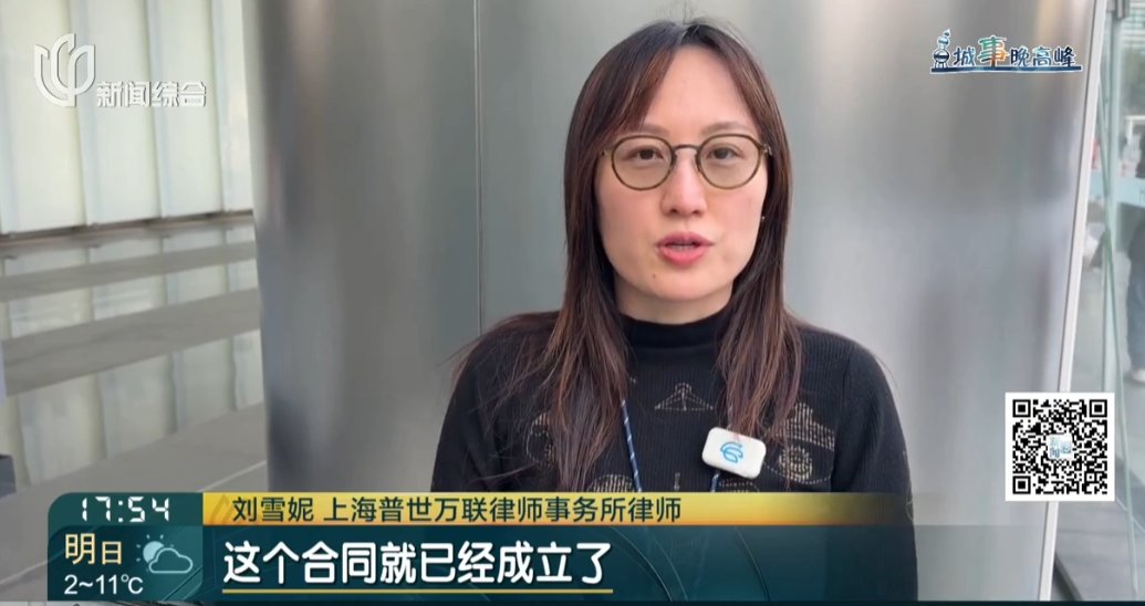 OCR:杰城事晚高峰 新闻综合 17:54 刘雪妮上海普世万联律师事务所律师 明日 这个合同就已经成立了 2~11℃