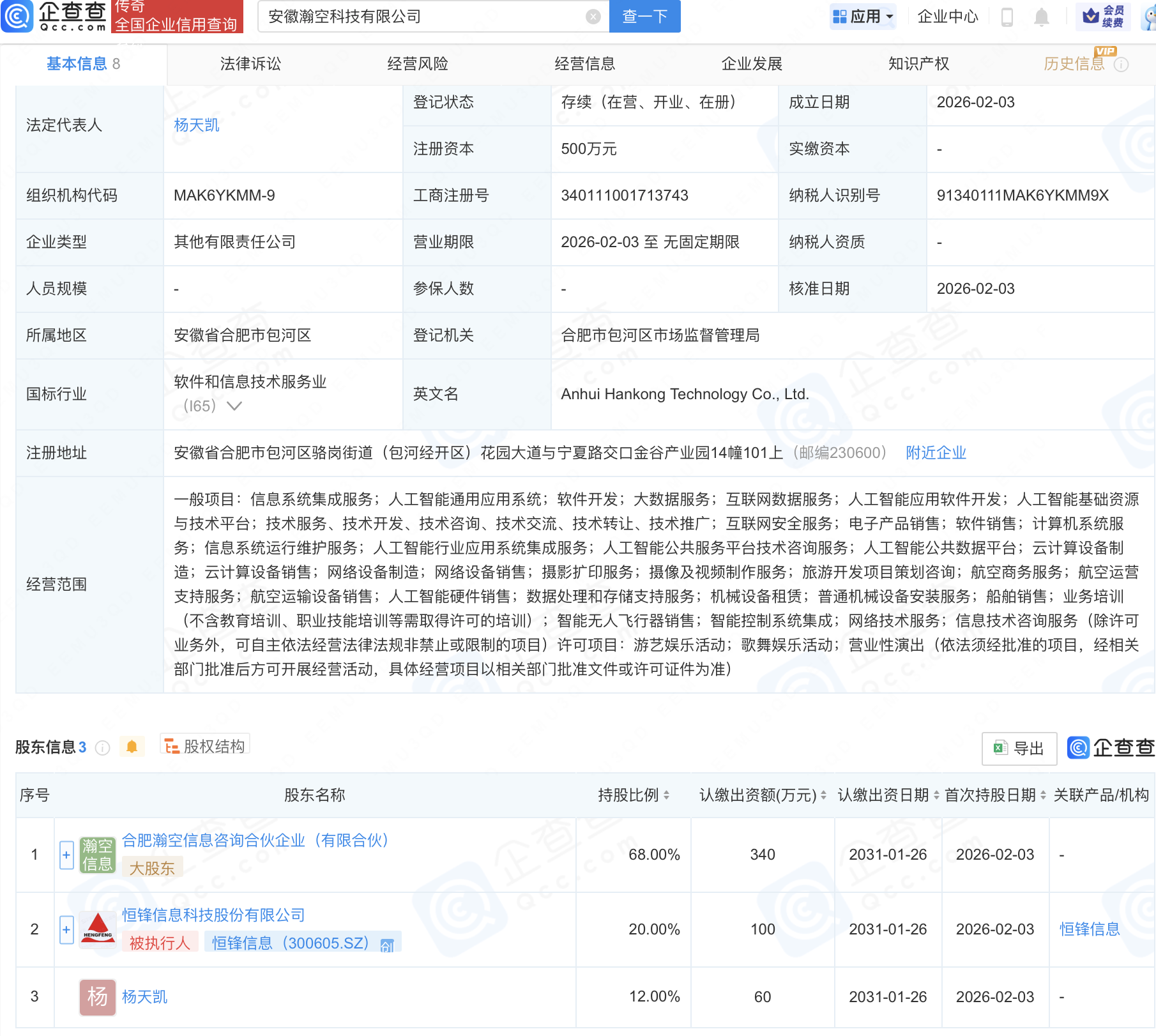 OCR:企查查 国企业信用查询 安徽瀚空科技有限公司 X 查一下 应用 企业中心 口 单 员 基本信息8 法律诉讼 经营风险 经营信息 企业发展 知识产权 历史信 登记状态 存续(在营、开业、在册) 成立日期 2026-02-03 法定代表人 杨天凯 注册资本 500万元 实缴资本 组织机构代码 MAK6YKMM-9 工商注册号 340111001713743 纳税人识别号 91340111MAK6YKMM9X 企业类型 其他有限责任公司 营业期限 2026-02-03至无固定期限 纳税人资质 人员规模 参保人数 核准日期 2026-02-03 所属地区 安徽省合肥市包河区 登记机关 合肥市包河区市场监督管理局 国标行业 软件和信息技术服务业 (165)V 英文名 Anhui Hankong Technology Co., Ltd. 注册地址 安徽省合肥市包河区骆岗街道(包河经开区)花园大道与宁夏路交口金谷产业园14幢101上(邮编230600)附近企业 一般项目:信息系统集成服务:人工智能通用应用系统:软件开发:大数据服务:互联网数据服务:人工智能应用软件开发:人工智能基础资源 与技术平台;技术服务、技术开发、技术咨询、技术交流、技术转让、技术推广;互联网安全服务;电子产品销售;软件销售;计算机系统服 务:信息系统运行维护服务;人工智能行业应用系统集成服务:人工智能公共服务平台技术咨询服务:人工智能公共数据平台:云计算设备制 经营范围 造:云计算设备销售;网络设备制造;网络设备销售:摄影扩印服务:摄像及视频制作服务;旅游开发项目策划咨询:航空商务服务:航空运营 支持服务:航空运输设备销售;人工智能硬件销售:数据处理和存储支持服务:机械设备租赁:普通机械设备安装服务:船舶销售:业务培训 (不含教育培训、职业技能培训等需取得许可的培训);智能无人飞行器销售:智能控制系统集成:网络技术服务:信息技术咨询服务(除许可 业务外,可自主依法经营法律法规非禁止或限制的项目)许可项目:游艺娱乐活动:歌舞娱乐活动:营业性演出(依法须经批准的项目,经相关 部门批准后方可开展经营活动,具体经营项目以相关部门批准文件或许可证件为准) 股东信息3 4 股权结构 导出 企查查 序号 股东名称 持股比例: 认缴出资额(万元):认缴出资日期:首次持股日期:关联产品/机构 合肥瀚空信息咨询合伙企业(有限合伙) 大股东 68.00% 340 2031-01-26 2026-02-03 恒锋信息科技股份有限公司 被执行人 20.00% 100 2031-01-26 恒锋信息(300605.SZ) 2026-02-03 恒锋信息 汤天前 12.00% 60 2031-01-26 2026-02-03