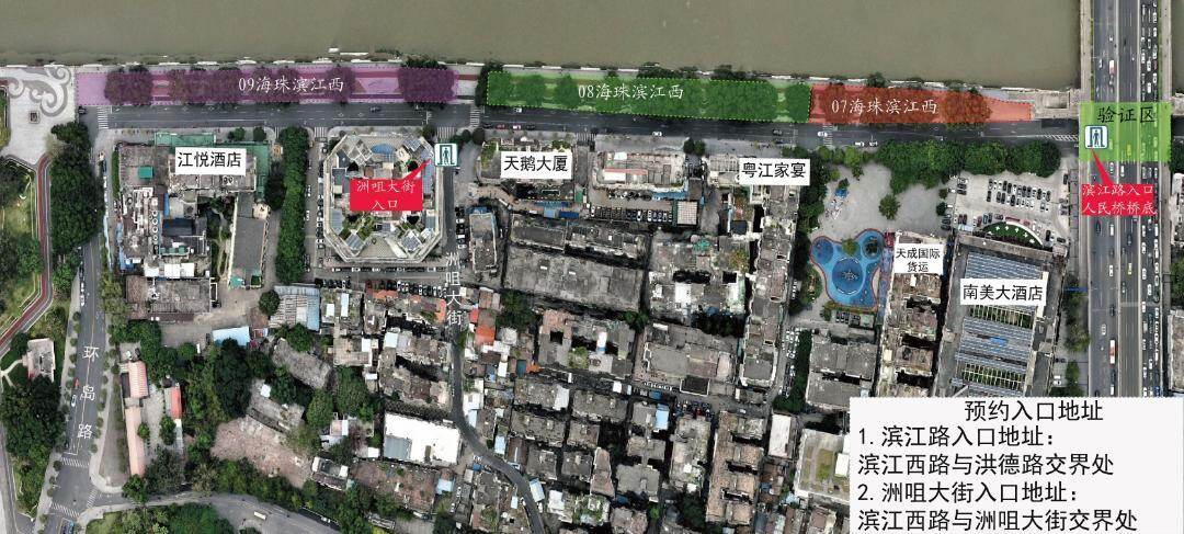 OCR:09海珠滨江西 08海珠滨江西 07海珠滨江西 证区 风 江悦酒店 天鹅大厦 江家宴 洲咀大街 #8二8-8 入口 民桥 天成国际 证 南美大酒店 预约入口地址 1.滨江路入口地址: 滨江西路与洪德路交界处 2.洲咀大街入口地址: 滨江西路与洲咀大街交界处