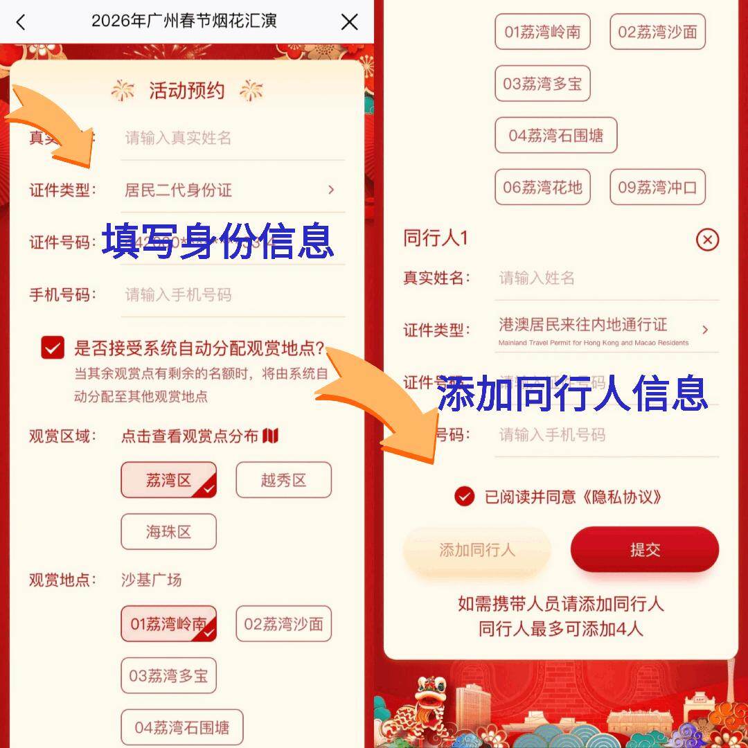 OCR:2026年广州春节烟花汇演 × 01荔湾岭南 02荔湾沙面 活动预约 1 米 03荔湾多宝 请输入真实姓名 04荔湾石围塘 证件类型: 居民二代身份证 06荔湾花地 09荔湾冲口 填写身份信息 证件号码: 同行人1 X 真实姓名: 请输入姓名 手机号码: 请输入手机号码 证件类型: 港澳居民来往内地通行证 是否接受系统自动分配观赏地点? 当其余观赏点有剩余的名额时,将由系统自 证件号 添加同行人信息 动分配至其他观赏地点 观赏区域: 点击查看观赏点分布 号码: 请输入手机号码 荔湾区 越秀区 已阅读并同意《隐私协议》 海珠区 添加同行人 提交 观赏地点: 沙基广场 如需携带人员请添加同行人 01荔湾岭南 02荔湾沙面 同行人最多可添加4人 03荔湾多宝 04荔湾石围塘