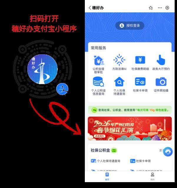 OCR:<穗好办 ☆ 扫码打开 穗好办支付宝小程序 二 授权登录 常用服务 糖好办 ¥ 公积金提 方效法律A 社保缴费明细 政务大厅预约 取审社 个人公积金 个人社保 社保卡申锁 证件照拍摄 信息查询 待遇查询 15g 查询社保、公积金、教育类等!每次可得15g绿色轻量! 26年广州日鹅厚 春节烟花汇演 点击预约 社保公积金 1 个人社保待遇查询 9 社保卡申锁 目 8 mn