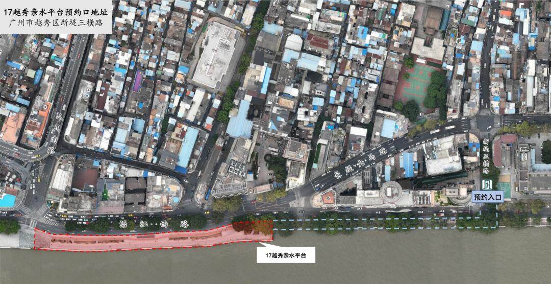 OCR:17越秀亲水平台预约口地址 广州市越秀区新堤三横路 预约入口 17越秀亲水平台