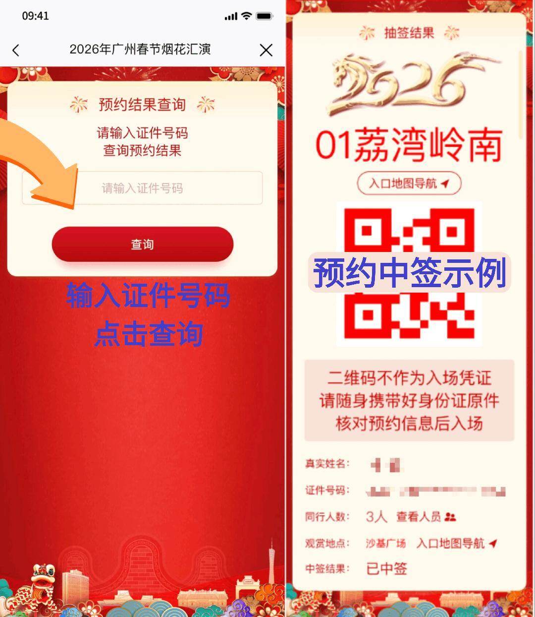 OCR:09:41 一 抽签结果 米 2026年广州春节烟花汇演 × 626 预约结果查询 米 请输入证件号码 01荔湾岭南 查询预约结果 请输入证件号码 入口地图导航 回:口 查询 预约中签示例 输入证件号码 可 点击查询 二维码不作为入场凭证 请随身携带好身份证原件 核对预约信息后入场 真实姓名: 证件号码: 二 同行人数: 3人查看人员 观赏地点: 沙基广场入口地图导航 中签结果: 已中签