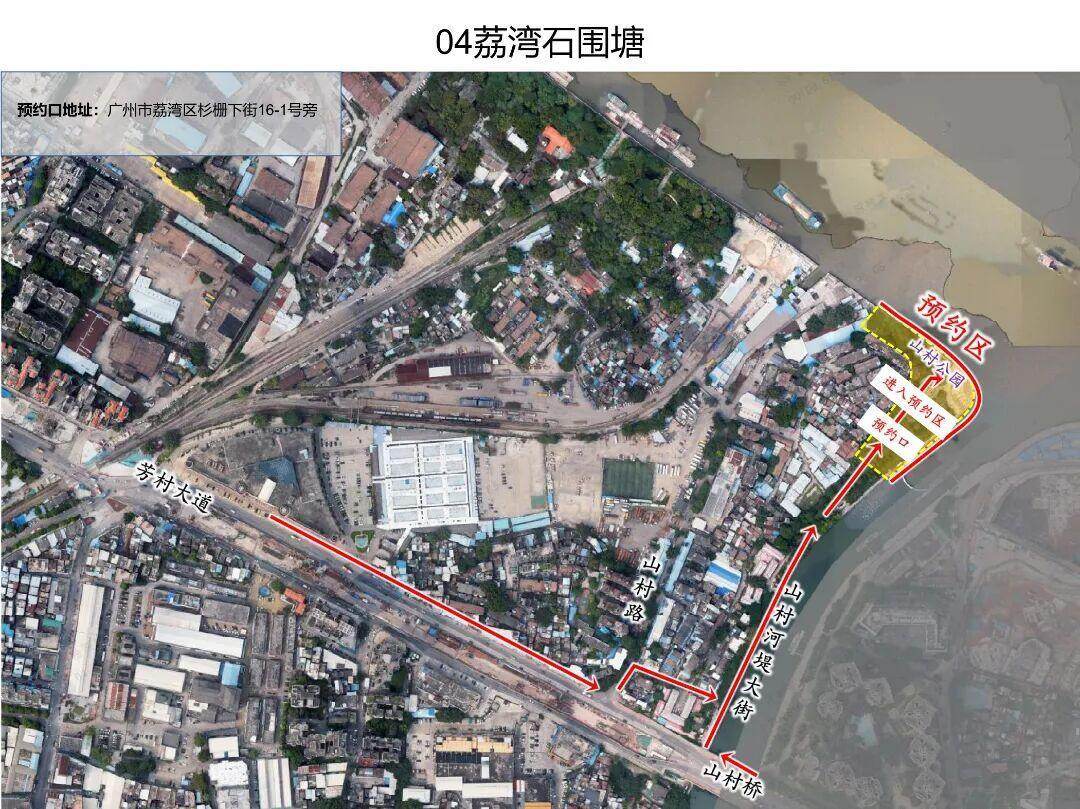 OCR:04荔湾石围塘 预约口地址:广州市荔湾区杉栅下街16-1号旁 预约区 进入 预约区 新 山村 子新 山村桥