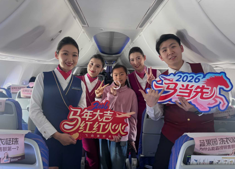 飞机进入平飞阶段,乘务长柳红豆巡舱时发现,57排一个小女孩正伏在小桌板上安静作画。走近看,画的是一匹长着翅膀的飞马。“这批小飞马画得真生动。”柳红豆轻声夸赞。小女孩抬起头,说:“阿姨,他要带我去乌鲁木齐找爸爸呢。他过年没回家,我去陪他过新年。我觉得坐飞机就像骑马一样,又快又稳。”柳红豆想为这位小旅客记录下这趟春运旅途里闪着光的瞬间,几位乘务员悄悄聚拢,邀请小旅客一起合照。大家轻轻比出“2026”的手势,快门声落在客舱微光里,像把春天提前装进了相框。
