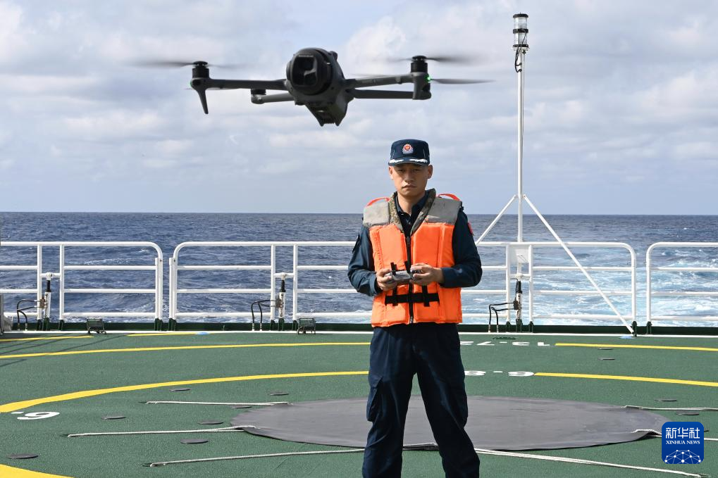 2月11日,中国海警万山舰执法员邱灿辉在舰艇航行时操控无人机。
