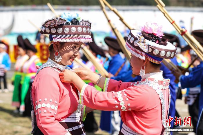 图为穿着节日盛装的苗族同胞在“跳洞”现场整理银饰。中新社记者 瞿宏伦 摄