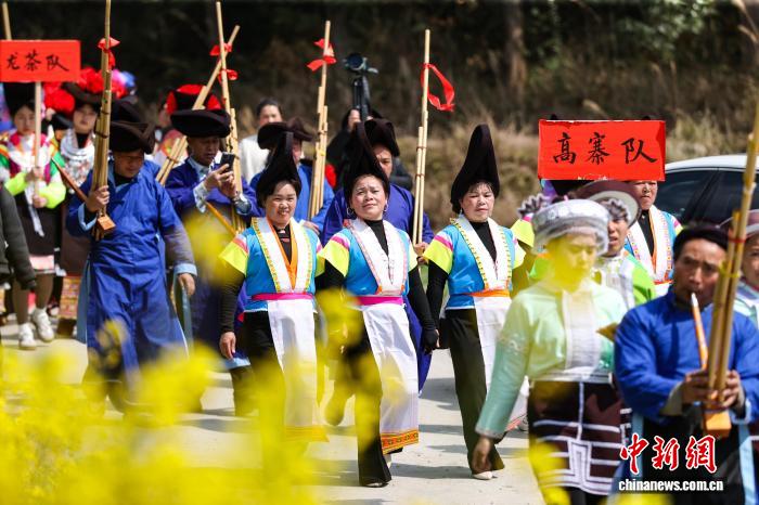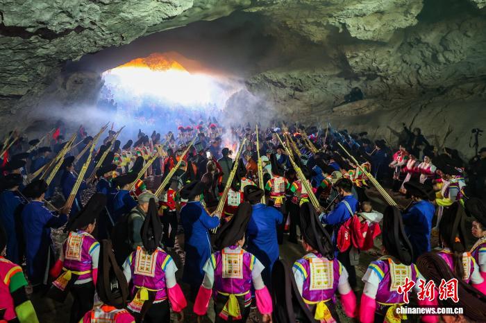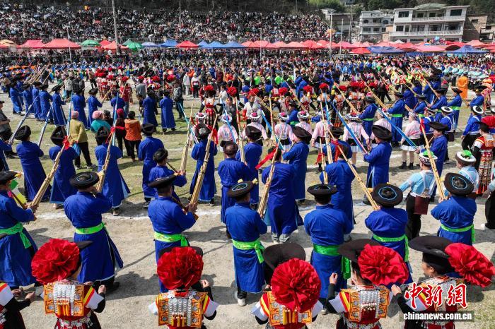 2月21日,农历正月初五,贵州省黔南州龙里县湾滩河镇果里村举行一年一度的“跳洞”祈福祭祀活动,上千名苗族民众集聚到一起,吹起芦笙跳起舞,欢庆新春佳节。“跳洞”苗语译为“数岜”,“数”有玩、望、看、跳等意思,“岜”指岩洞。“跳洞”不仅是当地苗族民众对来年风调雨顺的期盼,也是展现服饰、舞姿、芦笙演奏技艺的重要交际活动。如今,由于参与人数逐年增多,岩洞内空间有限,“跳洞”也拓展到了洞外。图为苗族民众吹起芦笙跳起舞。(无人机照片)中新社记者 瞿宏伦 摄