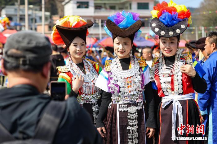 图为苗族民众穿着节日盛装在“跳洞”现场合影。中新社记者 瞿宏伦 摄