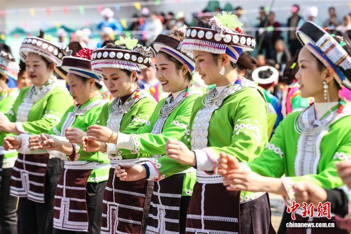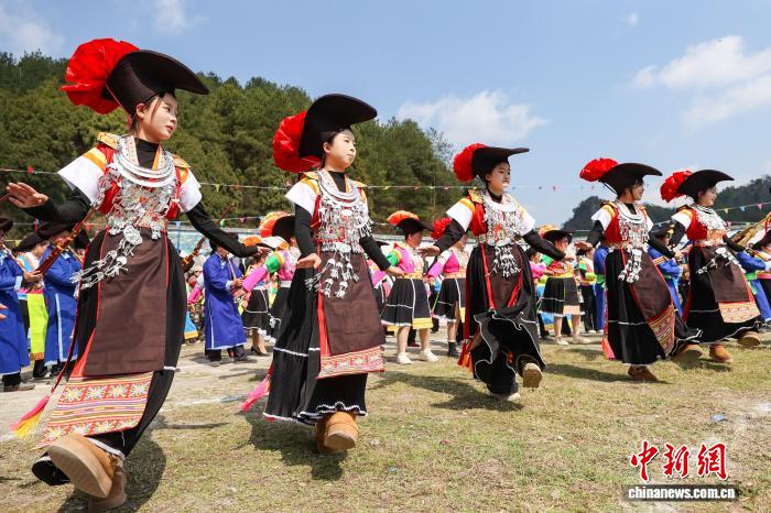 图为苗族民众穿着节日盛装跳舞。中新社记者 瞿宏伦 摄