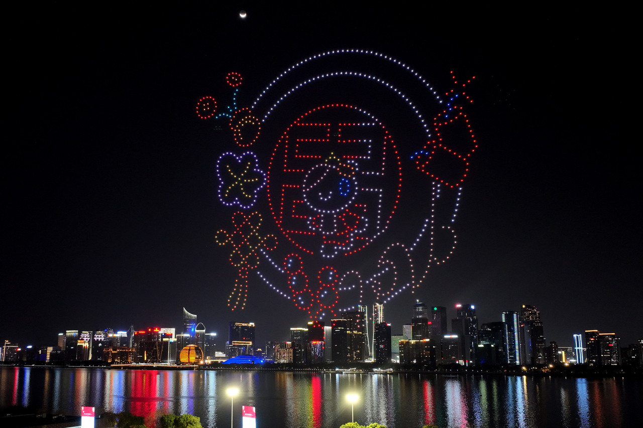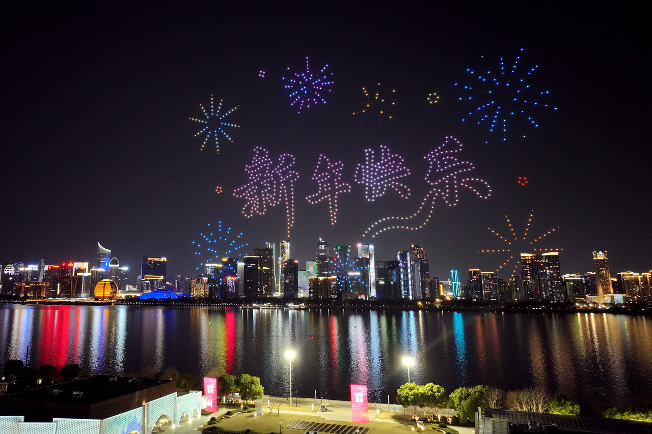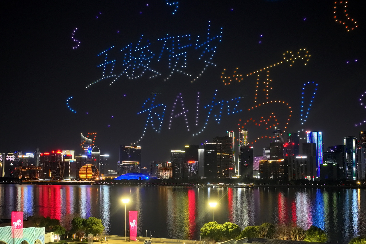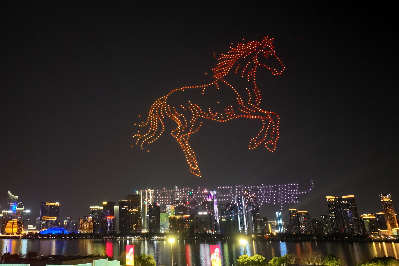 2月21日晚,一场以“天穹贺岁 马跃新程”为主题的2026春节无人机光影秀在杭州钱江世纪公园上演。浓浓的新春祝福,化作光影,与市民游客见面。现场1000架无人机同步升空,以天为幕,以光为笔,在城市上空灵活变换出“”五骏贺岁 为AI加马”“新年快乐”等字样。