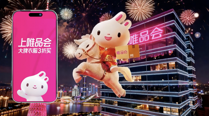 在这场光影盛宴中,唯品会的AI创新让科技与民俗实现了创新融合。为契合马年新春主题,品牌活用AI技术为自有IP“特卖兔”打造全新“踏马兔”皮肤,通过智能动画技术让虚拟形象“动起来”,在无人机编队与烟花光影的映衬下,成为当晚最具话题度的视觉亮点之一。这种AI驱动的IP创新,并非简单的形象改造,而是通过智能算法对岭南民俗元素、马年生肖文化的精准解构与艺术化呈现,让传统祝福以更具互动感的形式触达公众。