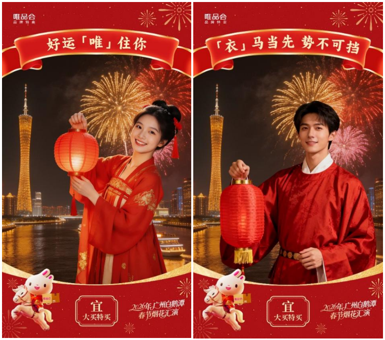 在互动体验层面,唯品会的AI技术进一步拉近了传统民俗与市民游客的距离。基于AI技术开发的趣味互动照片功能,将品牌祝福与新年寄语巧妙融合,市民和游客上传个人照片后,算法可匹配烟花背景、叠加新春元素,生成 “好运‘唯’住你” 等兼具个性化与氛围感的新春影像,简单操作即可获取专属祝福海报,让烟花下的美好瞬间得以长久留存与广泛传播。