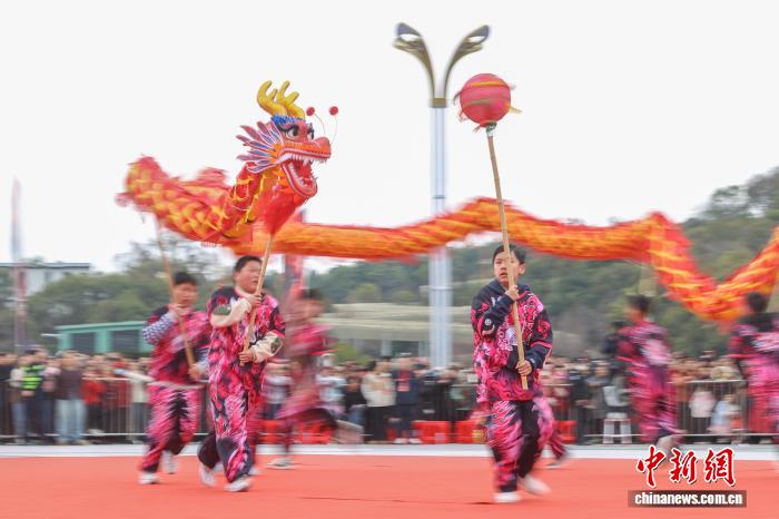 3月2日,元宵节前夕,2026年南昌市第三届龙狮邀请赛在江西南昌湾里管理局举行,来自南昌市各县(区)及邻市丰城市的十余支舞龙队伍齐聚一堂,先后登场亮相,众多民众在现场观赛。图为南昌市青山湖区代表队在舞龙,该队伍成员全部由当地小学的孩子们组成。中新社记者 刘力鑫 摄