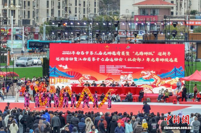 3月2日,元宵节前夕,2026年南昌市第三届龙狮邀请赛在江西南昌湾里管理局举行,来自南昌市各县(区)及邻市丰城市的十余支舞龙队伍齐聚一堂,先后登场亮相,众多民众在现场观赛。图为丰城市上塘镇代表队在舞龙。中新社记者 刘力鑫 摄