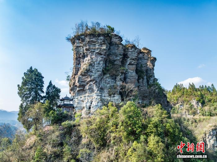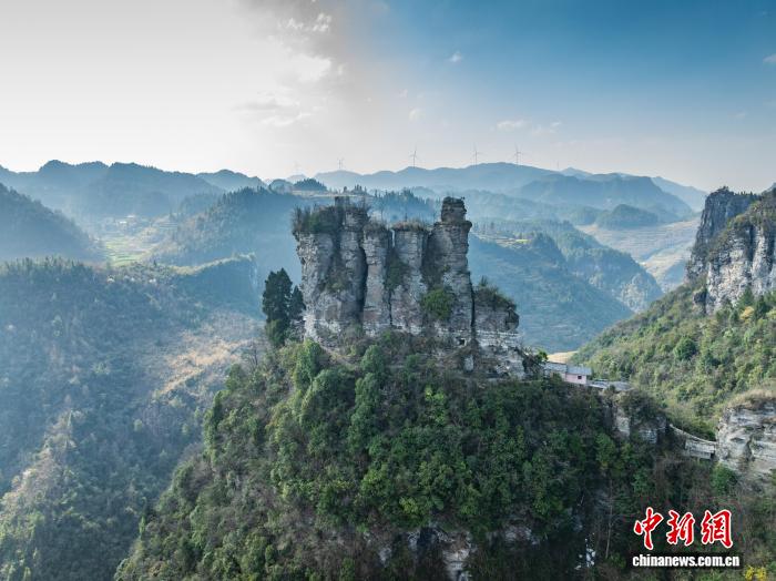 3月12日,航拍务川七柱山天然岩峰阵列景观。七柱山位于贵州省务川仡佬族苗族自治县黄都镇高洞村,历经亿万年风化侵蚀形成,七座岩峰整齐排列,景观独特。(无人机照片)唐哲 摄