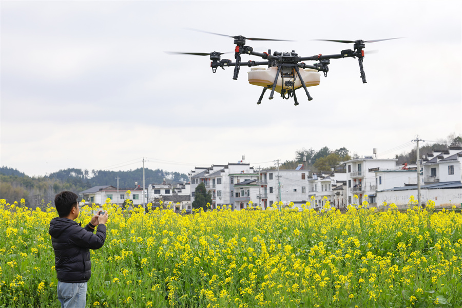 另一边,在黄山市屯溪区奕棋镇瑶干村连片的粮油基地里,植保无人机低空穿梭,均匀施肥。“一台无人机单日作业约500亩至600亩,效率相当于20名人工。”黄山奕丰农业科技有限公司负责人汪笃垚一边操作着智能终端一边说,“我们通过测土配方施肥技术精准追肥,设定好航线和肥量,就能实现精准、高效作业,大幅提升了防治效率,降低了成本。”