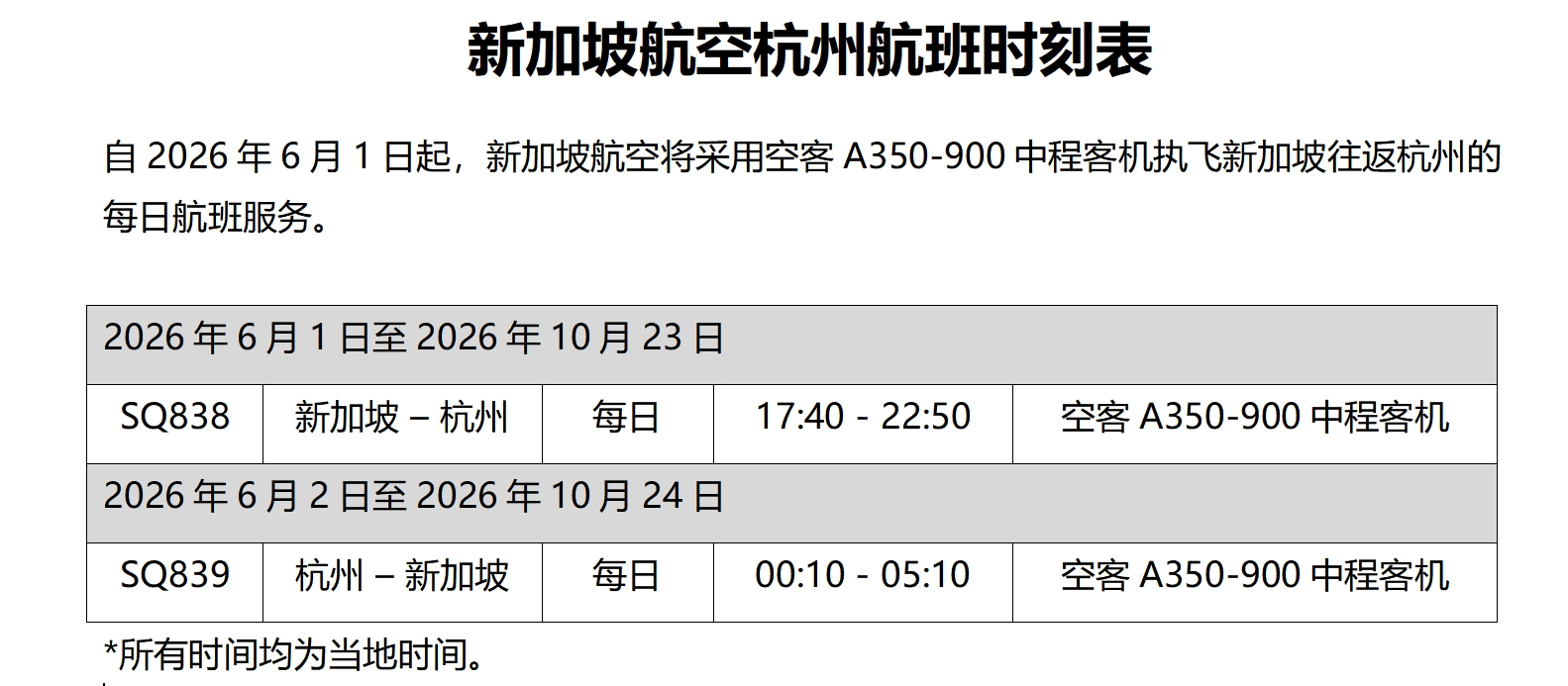 OCR:新加坡航空杭州航班时刻表 自2026年6月1日起,新加坡航空将采用空客A350-900中程客机执飞新加坡往返杭州的 每日航班服务。 2026年6月1日至2026年10月23日 SQ838 新加坡-杭州 每日 17:40 - 22:50 空客A350-900中程客机 2026年6月2日至2026年10月24日 SQ839 杭州-新加坡 每日 00:10 - 05:10 空客A350-900中程客机 *所有时间均为当地时间。