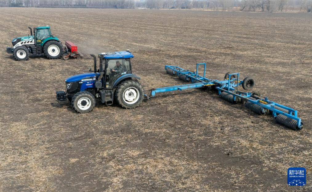 3月25日,播种机在位于黑龙江省哈尔滨市的北大荒集团闫家岗农场有限公司一处耕地上播撒小麦种子。