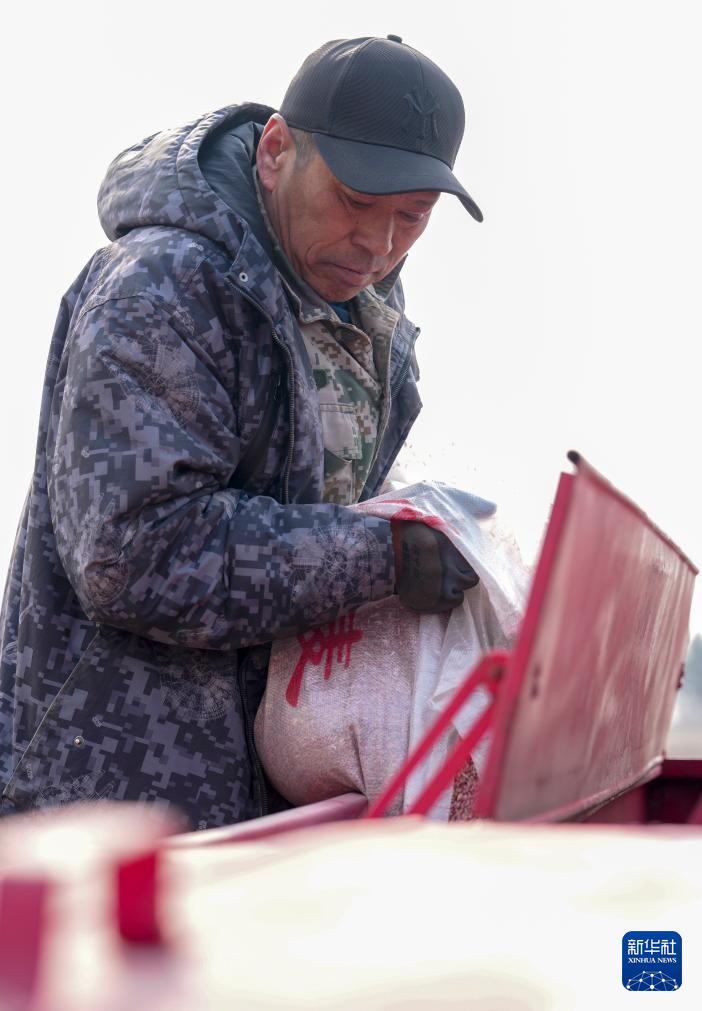 3月25日,农户在位于黑龙江省哈尔滨市的北大荒集团闫家岗农场有限公司一处地块将麦种加入播种机中。