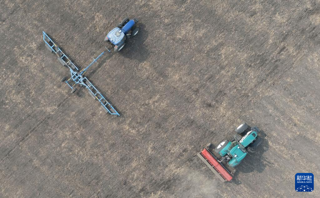 3月25日,农机在位于黑龙江省哈尔滨市的北大荒集团闫家岗农场有限公司一处耕地上播种小麦(无人机照片)。