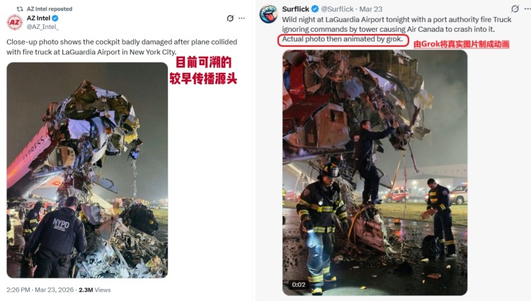 以拉瓜迪亚机场事件为例,事故本身是真实发生的,但网上流传的一些视频“并不是现场拍摄,而是由静态图片二次生成的动态画面”。之所以传播这么快,核心有三点: