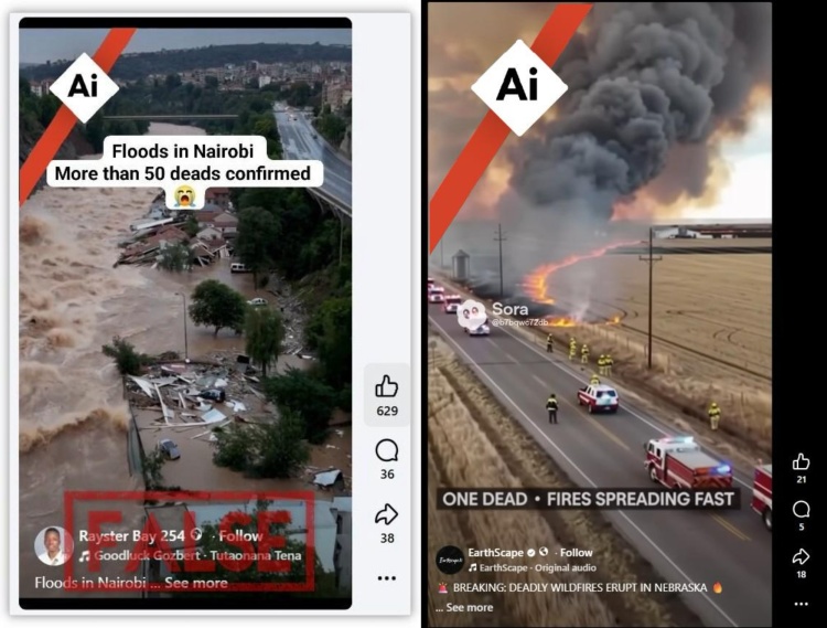 社交平台流传的"肯尼亚内罗毕洪灾"和"内布拉斯加州山火"AI图片