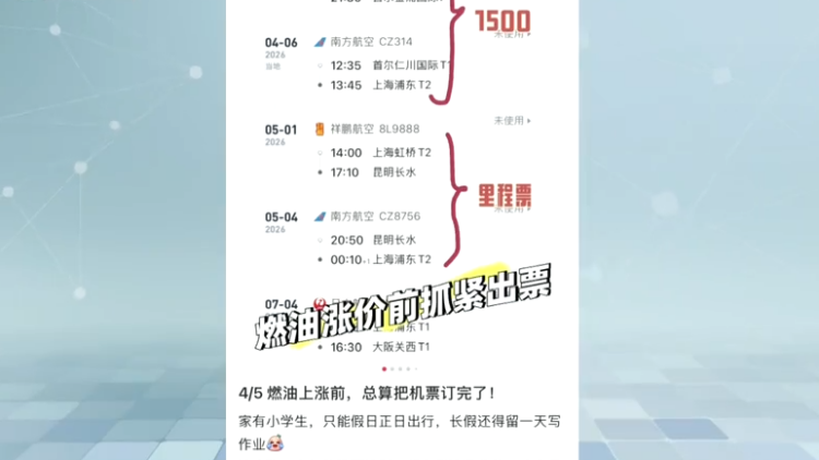 受中东局势持续影响,国际油价震荡,全球多家航司密集上调国际机票燃油费。多家机构预测,若油价维持高位,届时国内航线燃油费或上调至50元左右。清明假期、五一假期即将接连到来,不少网友在社交平台发帖称,赶在燃油附加费上涨前,提前囤购了机票,有人甚至买好了一整年的机票。不少网友在社交平台发帖称,赶在燃油附加费上涨前,提前囤购了机票,能买的都买了。25号,春秋航空率先发布通知,自4月5日零时起,上调国内航线燃油附加费。截至目前,国航、南航、东航等航司尚未发布调价通知。但业内普遍预计,其他航司也将陆续跟进。据了解,燃油附加费调整以订单时间为准,4月5日零时前出票,即便航班在之后起飞,仍按现行标准收取。此外,多家航司已上调国际航线燃油附加费,涨幅普遍超50%,部分航线翻倍。受涨价预期影响,今年五一机票预订明显提前,预计预订量还将持续增多。
